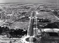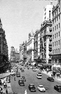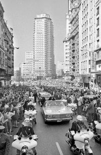 El 7 de octubre de 1969, los astronautas de la misión Apolo 11, Neil Armstrong, Buzz Aldrin y Michael Collins visitan Madrid, desfilando en coche a su paso por Gran Vía